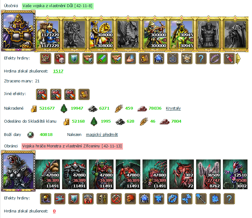 Když jsme po urputné a krvavé bitvě plné obětí slavně zvítězili a monstra porazili, ujali se své role kněží a ošetřovatelé. Ovázali zraněné a (s pomocí boží) přivedli nazpět naše padlé udatné bojovníky. Ne vždy se to povede, nicméně tentokrát byl evidentně Bůh spokojen s naším snažením a dovolil kněžím vzkřísit všechny naše padlé. Poté jsem na bojišti vyhledal i padlého vůdce monster. Mocné artefakty, brnění a zbraně, které měl u sebe, jsme s velkou lítostí museli zničit, protože byly tak prosáklé temnou magií, že se nedaly použít – kdokoli by se o to pokoušel, byl by okamžitě proklet a velmi brzy by zemřel v krutých bolestech. Nicméně jsme u něj našli nějaký magický svitek a několik magických drahokamů, o kterých dvorní mág prohlásil, že po důkladné očistě je bude schopen využít. Nakonec můj pobočník objevil i místnost, kde monstra shromažďovala lup. Bylo zde nějaké zlato, vzácné meteorické železo a špalky ušlechtilého tisového dřeva určeného k výrobě zbraní, zásoba jídla a kámen na opravu hradu. Co mě ovšem hodně překvapilo, nalézala se zde i hromada vzácných černých mořských perel – je zajímavé, jak mnoho jich monstra dokázala za tak krátkou dobu nashromáždit – více než čtyři věrtele.