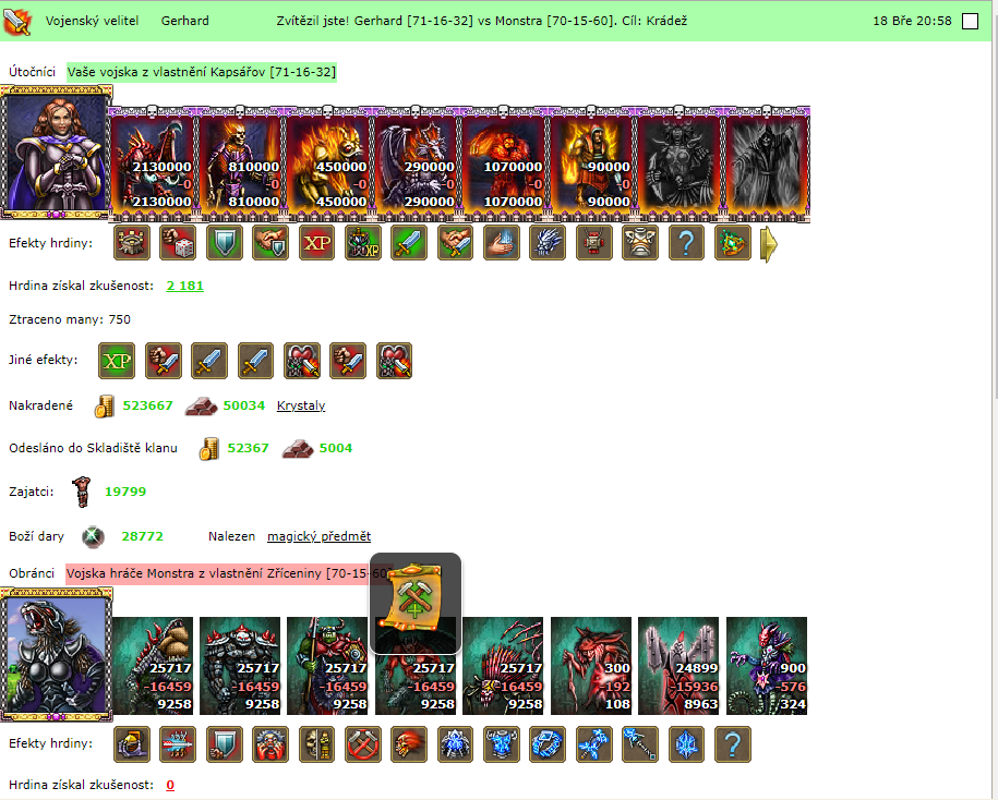 Je to tady, přišla mě zpráva o výsledku boje. S rozechvělými prsty otevírám hlášení. Zelená obálka, tak to je úspěch. Nevěřícně koukám do hlášení. Nepřišli jsme ani o jednoho vojáčka, ani jeden kůň nepadnul, moji léčitelé téměř neměli koho léčit. Opravdu nechápu, jak mohli s tak mizernou armádou nashromáždit takové bohatsví. Co vám budu dál povídat, ještě než se armáda vrátila i s poklady zpět do města, již mě chodili gratulace od přátel. A dokonce i někdo z nepřátel zaslal uznalý dopis. Gedža se po návratu tváří naštvaně. Co se děje? Táži se. Příště mě na takové břídily ani neposílej, brblá naštvaně. Tohohle nepřítele by zvládnul i náš nýmand Murphy. Nebýt těch pokladů, tak jdu radši k jinému vojevůdci. No co, jsou bitvy kruté a nemilosrdné o kus území, které stojí stovky tisíc, nebo i miliony životů a pak jsou bitvy plytké, které přinesou velký zisk. Však ona si Gedža ještě užije pořádného maskru, po kterém tak touží. A já doufám, že na další takové bohatství narazím dřív, než zase za 10 let.