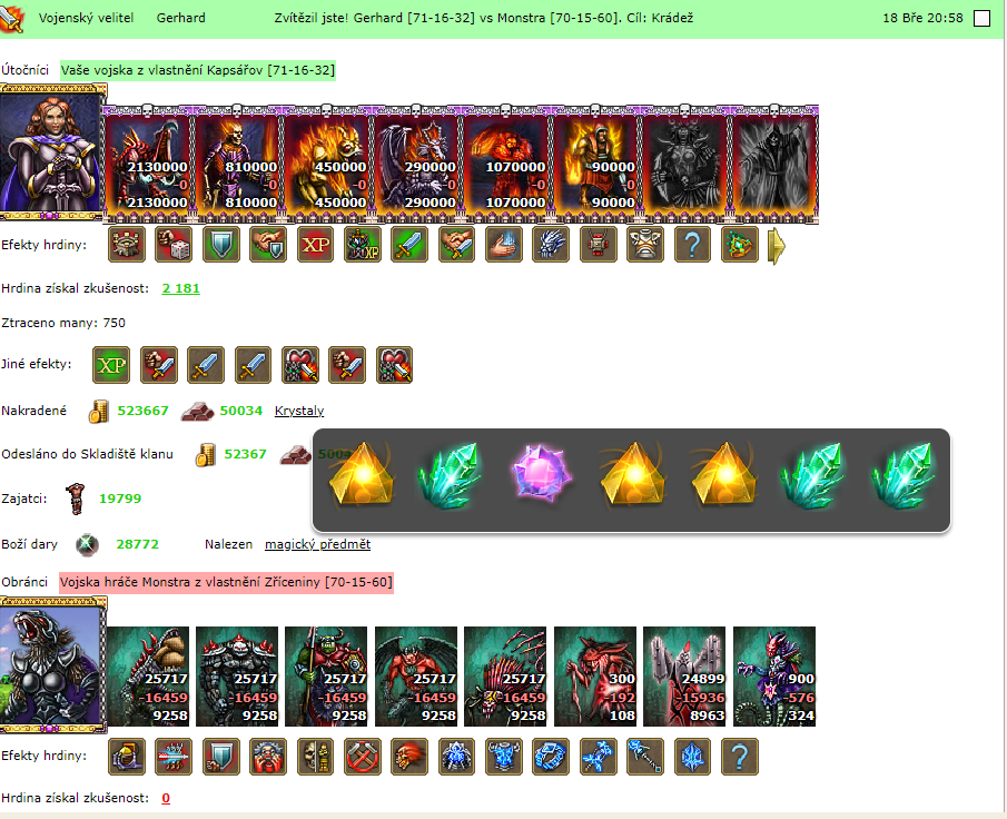 Je to tady, přišla mě zpráva o výsledku boje. S rozechvělými prsty otevírám hlášení. Zelená obálka, tak to je úspěch. Nevěřícně koukám do hlášení. Nepřišli jsme ani o jednoho vojáčka, ani jeden kůň nepadnul, moji léčitelé téměř neměli koho léčit. Opravdu nechápu, jak mohli s tak mizernou armádou nashromáždit takové bohatsví. Co vám budu dál povídat, ještě než se armáda vrátila i s poklady zpět do města, již mě chodili gratulace od přátel. A dokonce i někdo z nepřátel zaslal uznalý dopis. Gedža se po návratu tváří naštvaně. Co se děje? Táži se. Příště mě na takové břídily ani neposílej, brblá naštvaně. Tohohle nepřítele by zvládnul i náš nýmand Murphy. Nebýt těch pokladů, tak jdu radši k jinému vojevůdci. No co, jsou bitvy kruté a nemilosrdné o kus území, které stojí stovky tisíc, nebo i miliony životů a pak jsou bitvy plytké, které přinesou velký zisk. Však ona si Gedža ještě užije pořádného maskru, po kterém tak touží. A já doufám, že na další takové bohatství narazím dřív, než zase za 10 let.